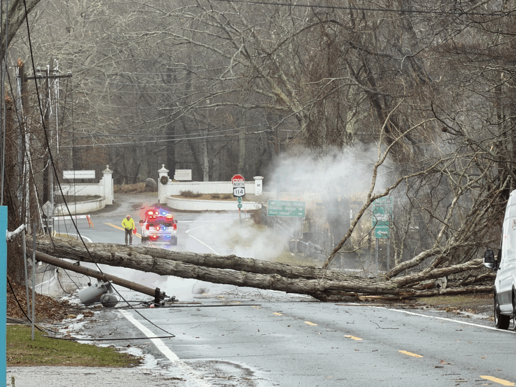Winds of 20 to 30 mph, gusting as high as 60 mph, were reported, bringing down trees all over the Island, some crashing onto power lines and taking them down with them as they fell, causing widespread outages.